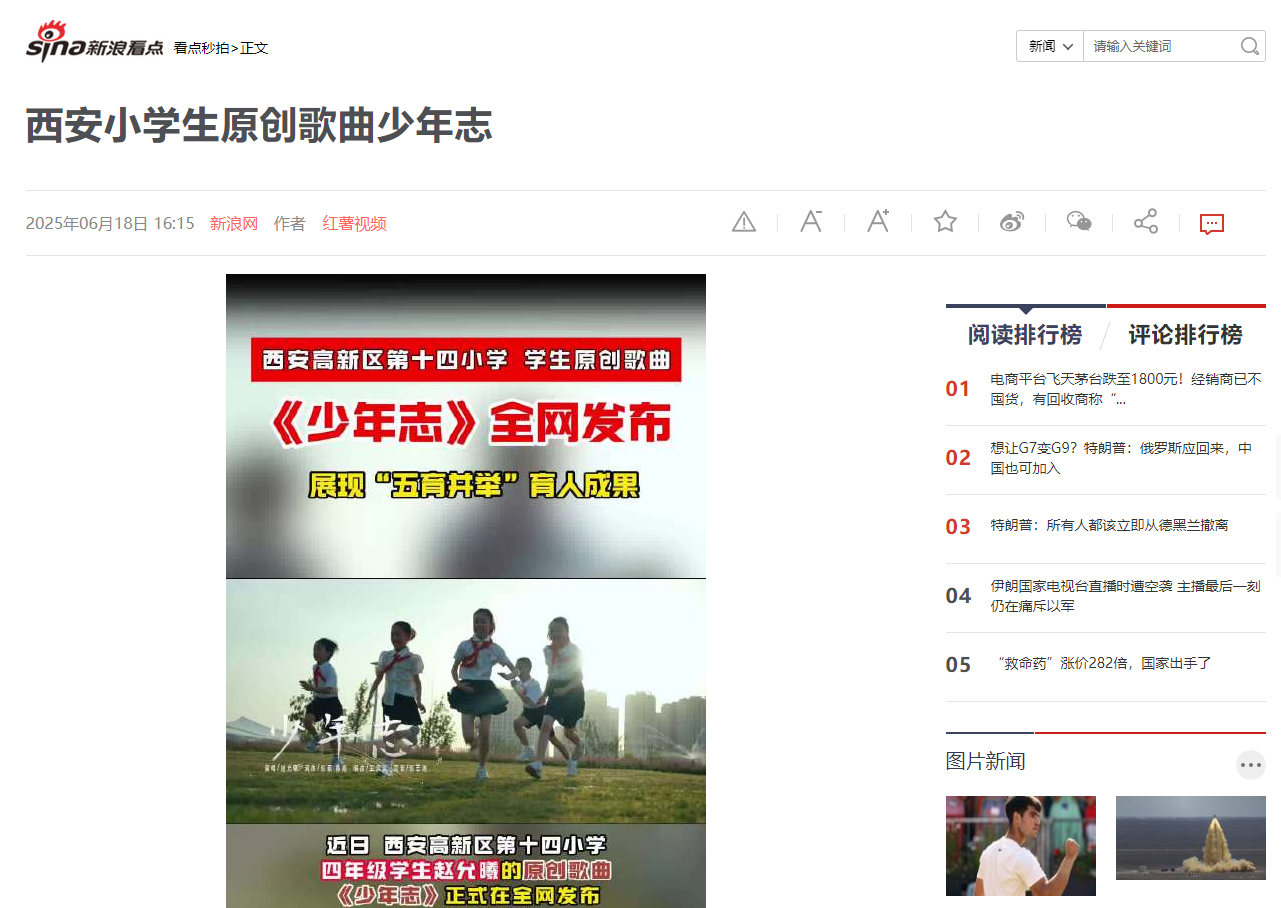 【西安小学生原创歌曲少年志】近日,西安市高新区第十四小学四年级学生赵允曦原创歌曲《少年志》在全网发布。赵允曦同学以其阳光自信的表现,昂扬的旋律和勇敢追梦的正能量完美诠释了”新时代好少年“的生动形象。